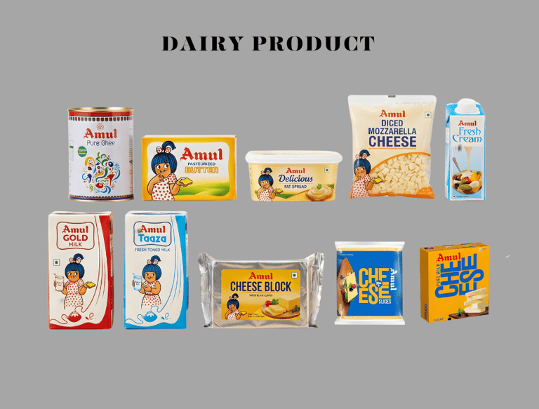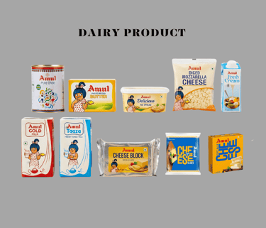 Amul Pure Ghee, Amul Pasteurized Butter, Amul Delicious Fat Spread, Amul Diced Mozzarella Cheese, Amul Fresh Cream, Amul Gold Milk, Amul Taaza Fresh Toned Milk, Amul Cheese Block, Amul Cheese Slices, and Amul Cheese.