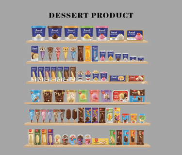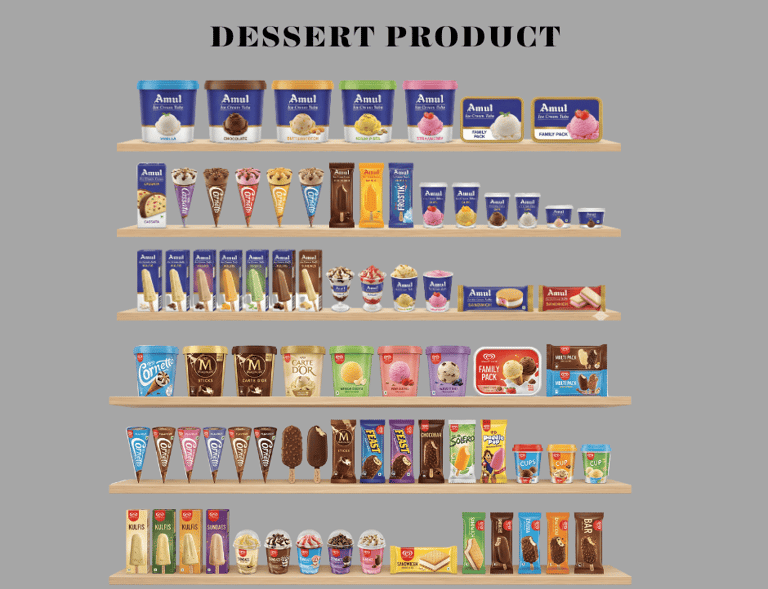 Amul Tubs (Vanilla, Chocolate, Butterscotch, Kesar Pista, Strawberry), Family Packs, Cassata, Tricones, Chocobars, Frostik, Cups, Koolfies, Epics, Sundaes, and Sandwiches. Kwality Wall's Cornetto, Magnum, Carte D'Or Tubs, Family Packs, Multipacks, Feast, Solero, Paddle Pop, Kulfis, Sundae cups, and Ice Cream Sandwiches.