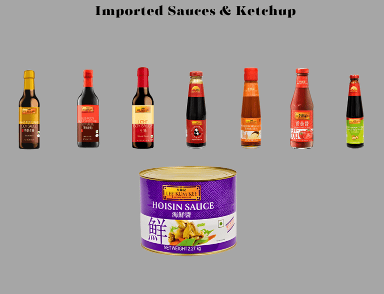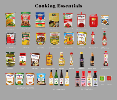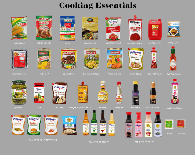 Corn Flour, Bread Crumbs, Pasta, Aromatic Mix, Tomato Ketchup, Szechuan Chutney, Tomato Sauces, Crispy Cajun, Red Pasta Sauce, Corn Soup, Black Olives, Button Mushroom, Fruit Cocktail, Cheese Blend, Red Chilli Sauce. Pepper Sauce, Gherkins, Jam, Dressing, Ginger & Garlic Paste, Kasundi, Vinegar, Marinade, Oyster Sauce, Dark Soys Sauce, All Type of Mayonnaise, All Type of Syrup, All Type of Crush, Oregano, Chilli Flakes.