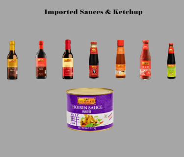 Premium Dark Soy Sauce, Mushroom Flavoured Dark Soy Sauce, Light Soy Sauce, Panda Brand Oyster Sauce, Blended Sesame Oil, Tomato Ketchup, Vegetarian Oyster Flavoured Sauce, and Hoisin Sauce.