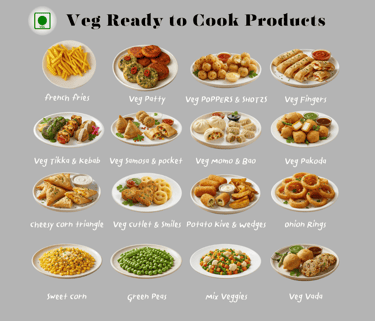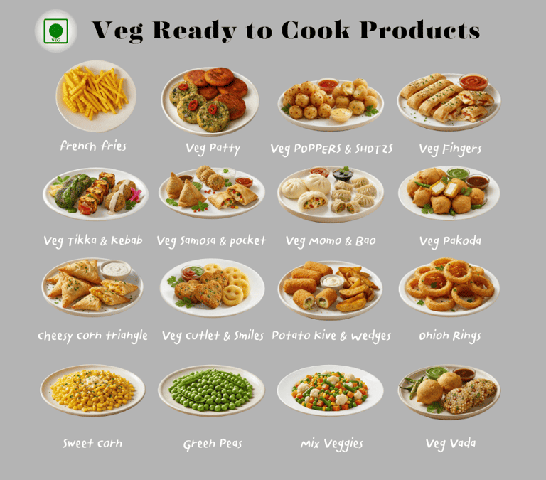 french fries, Veg Patty, Veg POPPERS & SHOTZS, Veg Fingers, Veg Tikka & Kebab, Veg samosa & pocket, Veg momo & Bao, Veg Pakoda, cheesy corn triangle, Veg cutlet & smiles, Potato kive & wedges, onion Rings, Sweet corn, Green Peas, Mix Veggies, and Veg Vada.