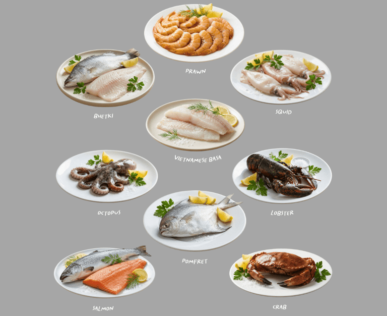 Prawn, Squid, Bhetki, Vietnamese Basa, Lobster, Octopus, Crab, Salmon, and Pomfret.