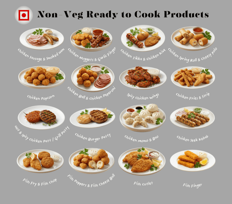 chicken sausage & smoked Ham, chicken Nuggets & Garlic Finger, chicken tikka & chicken kive, chicken spring Roll & cheesy polo, chicken Popcorn, chicken Ball & chicken Peperoni, Spicy chicken wings, chicken Fries & strip, hot & spicy chicken Patt / Grill Patty, chicken Burger Patty, chicken momo & Bao, chicken seek kebab, Fish Fry & Fish chop, Fish Poppers & Fish cheese Ball, Fish cutlet, and Fish Finger.